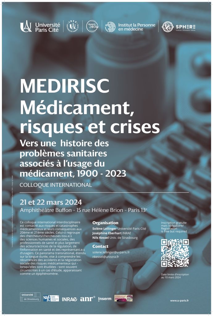 - Colloque international « MEDIRISC : Médicament, risques et crises. Vers une histoire des problèmes sanitaires associés à l’usage du médicament, 1900-2023 » (21-22 mars 2023) https://medirisc.wordpress.com – Projet lauréat de l’AAP de l’Institut La Personne en Médecine